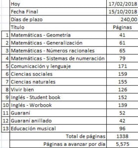Tomemos el caso de 1.º de secundaria, considerando todos los libros de texto (4 libros de matemáticas, 1 de Lenguaje, 1 de Ciencias Sociales, 1 de Ciencias Naturales, 1 de Religión, 2 de Inglés y 2 de Guaraní), tenemos 1.338 páginas a avanzar en 240 días (8 meses), lo que nos da un promedio de 6 páginas por día. Luego, el horario de clases es de 07:15 a 12:45 de lunes a viernes, y una vez por semana de 14:30 a 16:50, lo que nos da un total de 29 horas y 50 minutos, por semana, casi 30 horas por semana.